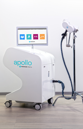 Our outpatient TMS Therapy in Georgia utilizes the Apollo TMS Therapy System. The Apollo TMS Therapy system sends short bursts of high frequency magnetic pulses through the patient’s scalp to specific points on the surface of the brain. These magnetic pulses are delivered through a coil placed on the patient’s head. A computer controls the delivery of the pulses.